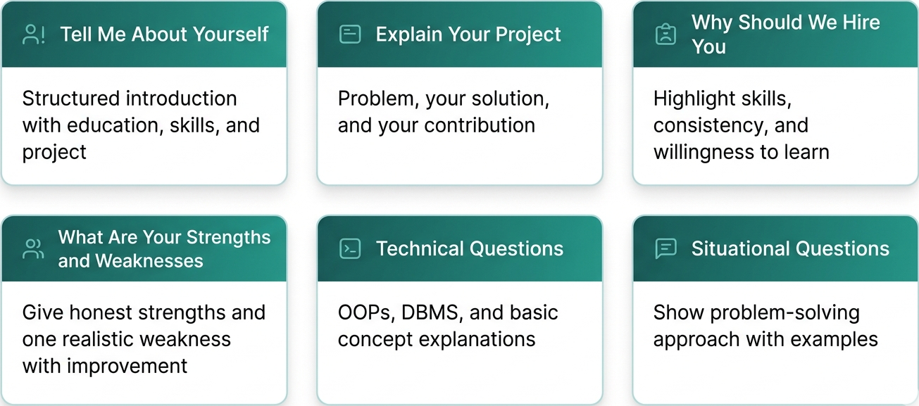 | HR Interview | Communication and confidence | Prepare structured answers |